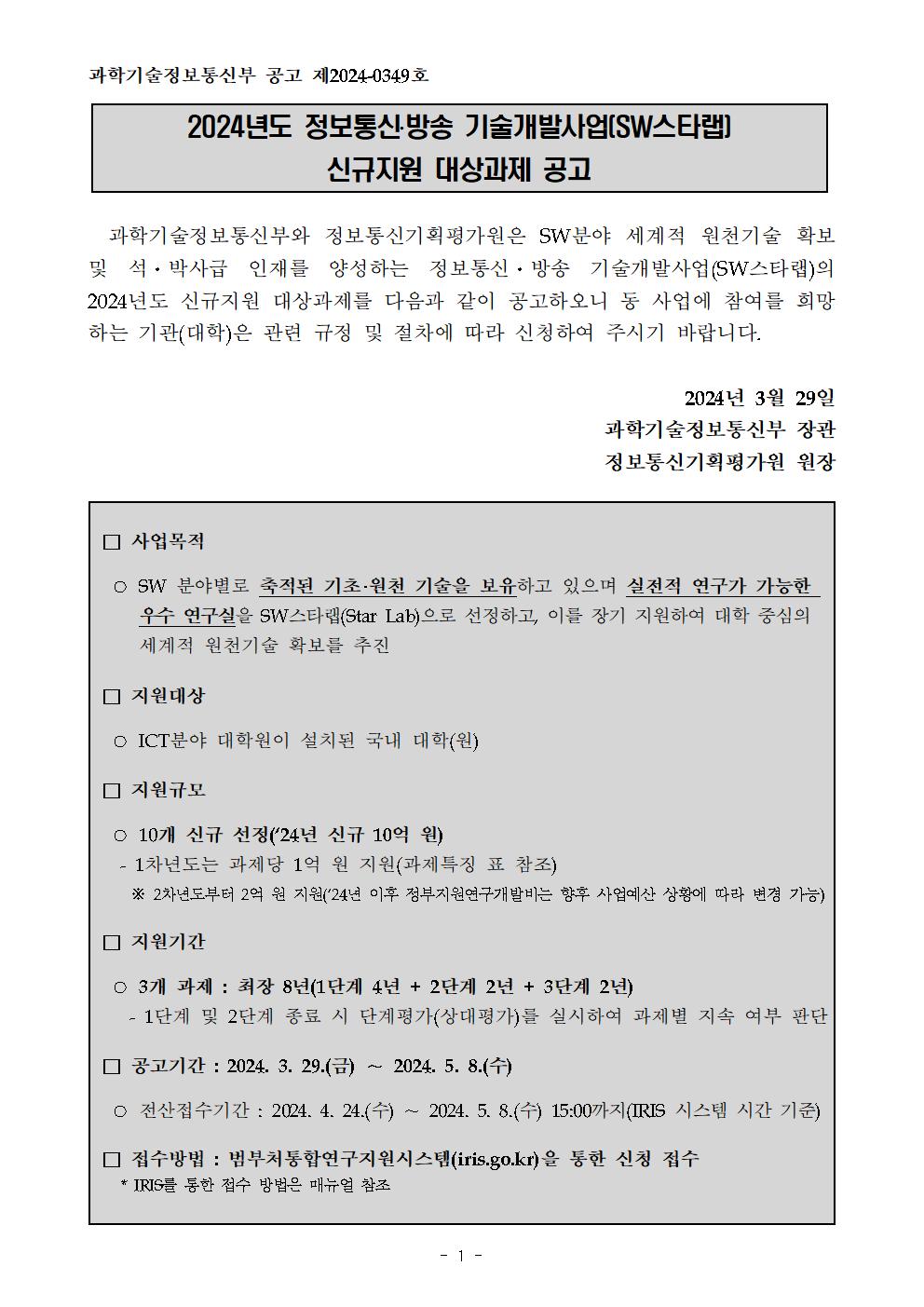 2024년 SW스타랩 신규지원 대상과제 공고