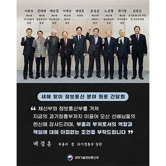 왼쪽부터 이종호 제4대 과학기술정보통신부 장관, 진대제 제9대 정보통신부 장관, 배순훈 제4대 정보통신부 장관, 이대순 제35대 체신부 장관, 배경훈 부총리, 윤동윤 제40대 체신부 장관, 노준형 제10대 정보통신부 장관, 최기영 제2대 과학기술정보통신부 장관, 김창곤 전 정보통신부 차관(정우회 회장)., thumbImg=Y, atchFileNo=null, pstgBgngDt=2026-01-22 11:00:00.0, pstgEndDt=9999-12-31 00:00:00.0, pstgBgngDtTime=2026-01-22 11:00:00.0, pstgEndDtTime=9999-12-31 00:00:00.0}]